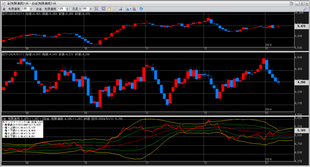 金白金の鞘をボリンジャーバンドで見ていきます。