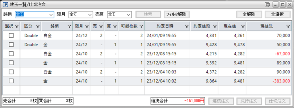 鞘拡大の仕掛け金買い1枚-白金売り2枚を3組、保持しております。