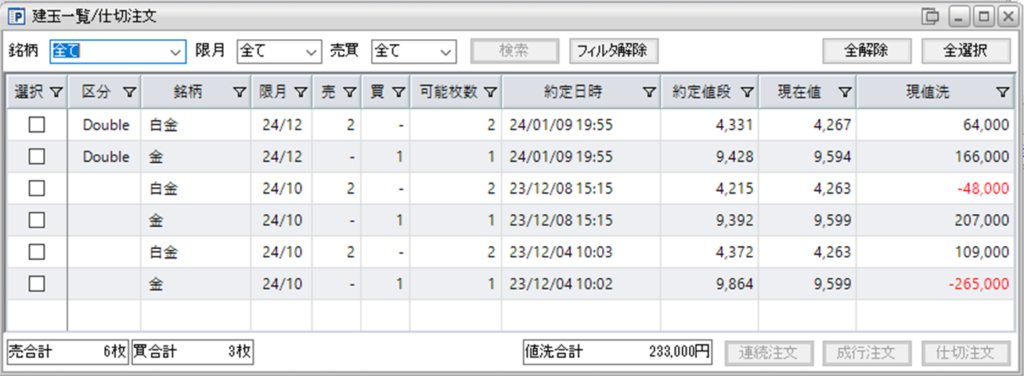 鞘拡大の仕掛け金買い1枚-白金売り2枚を3組、保持しております。