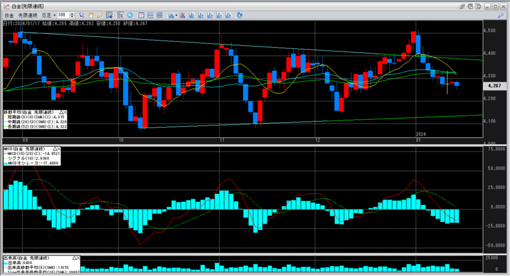白金のチャートを見ると、4,100円から4,200円を下値とし、