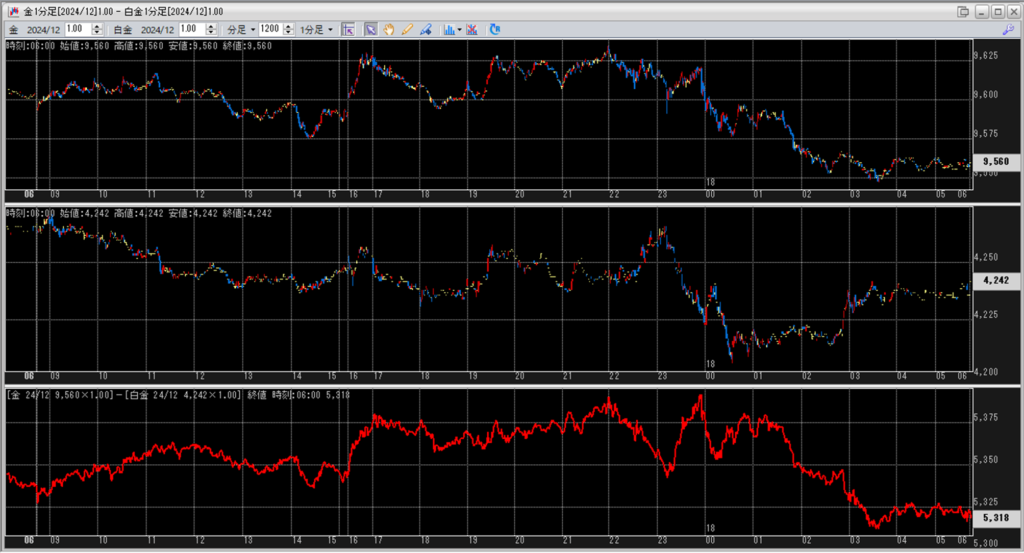 下:金白金鞘(金白金の価格差 = 金1グラムの価格 - 白金1グラムの価格)