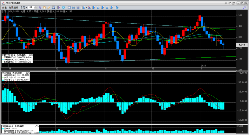 白金のチャートを見ると、4,100円から4,200円を下値とし、