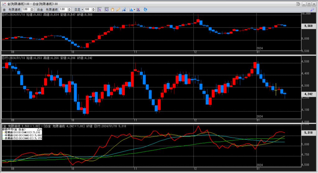 下記に金白金鞘の移動平均線のチャートを貼り付けています。