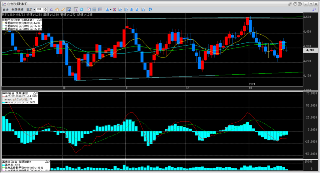 白金のチャートを見ると、4,100円から4,200円を下値とし、
