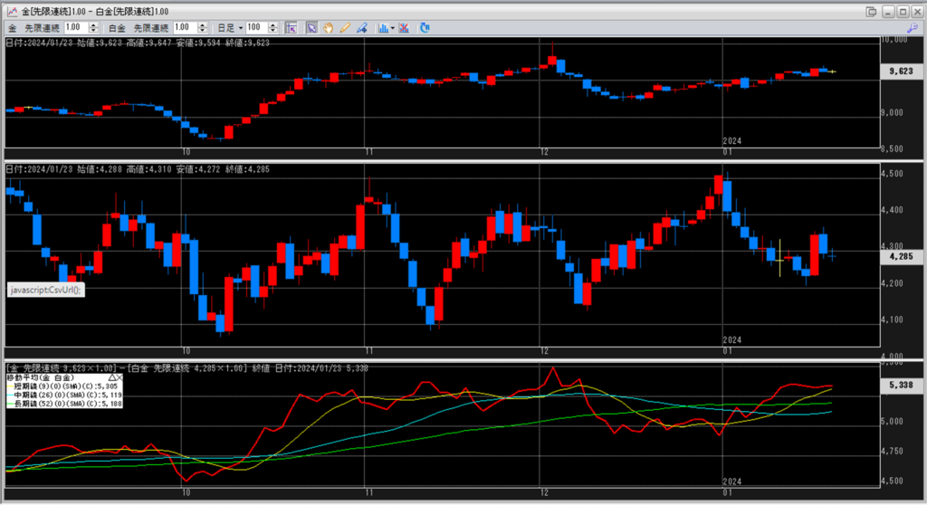 下記に金白金鞘の移動平均線のチャートを貼り付けています。