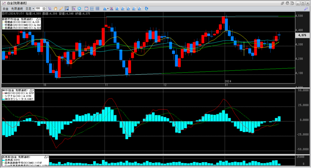 白金のチャートを見ると、4,100円から4,200円を下値とし、