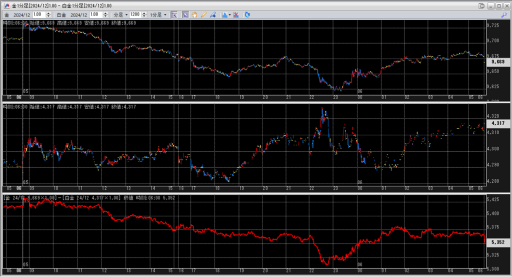 下:金白金鞘(金白金の価格差 = 金1グラムの価格 - 白金1グラムの価格)