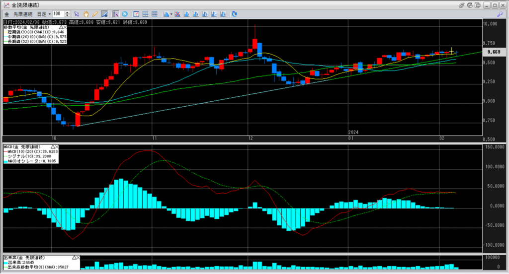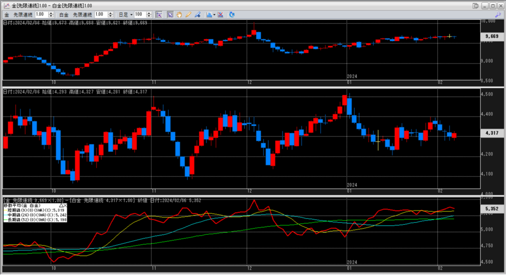 下記に金白金鞘の移動平均線のチャートを貼り付けています。