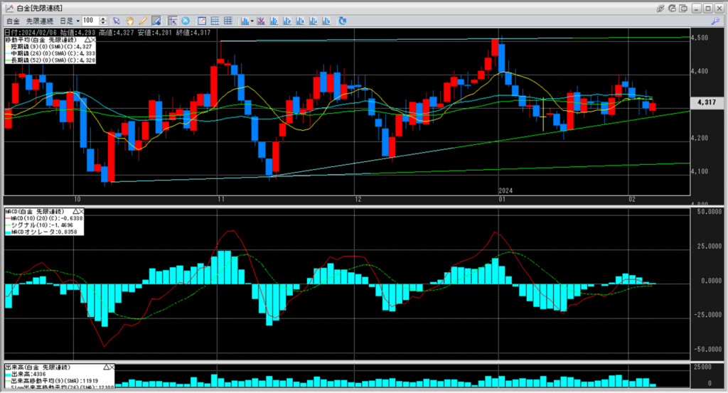 白金のチャートを見ると、4,100円から4,200円を下値とし、