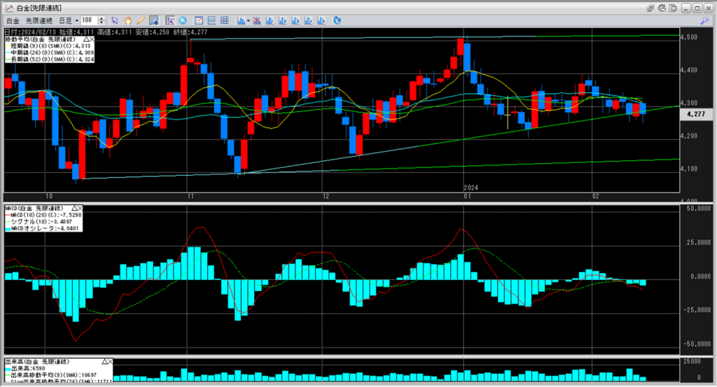 白金のチャートを見ると、4,100円から4,200円を下値とし、