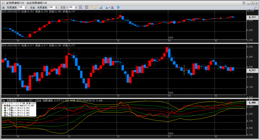 金白金の鞘をボリンジャーバンドで見ていきます。