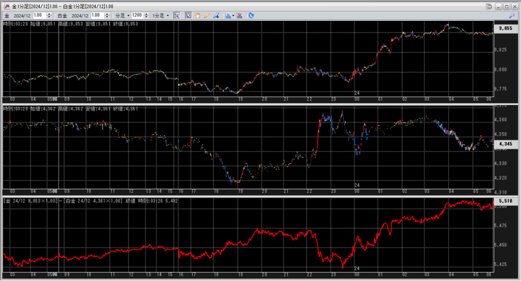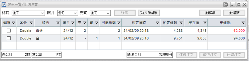 現在、鞘拡大の仕掛け金買い1枚-白金売り2枚を1組、保持しています。