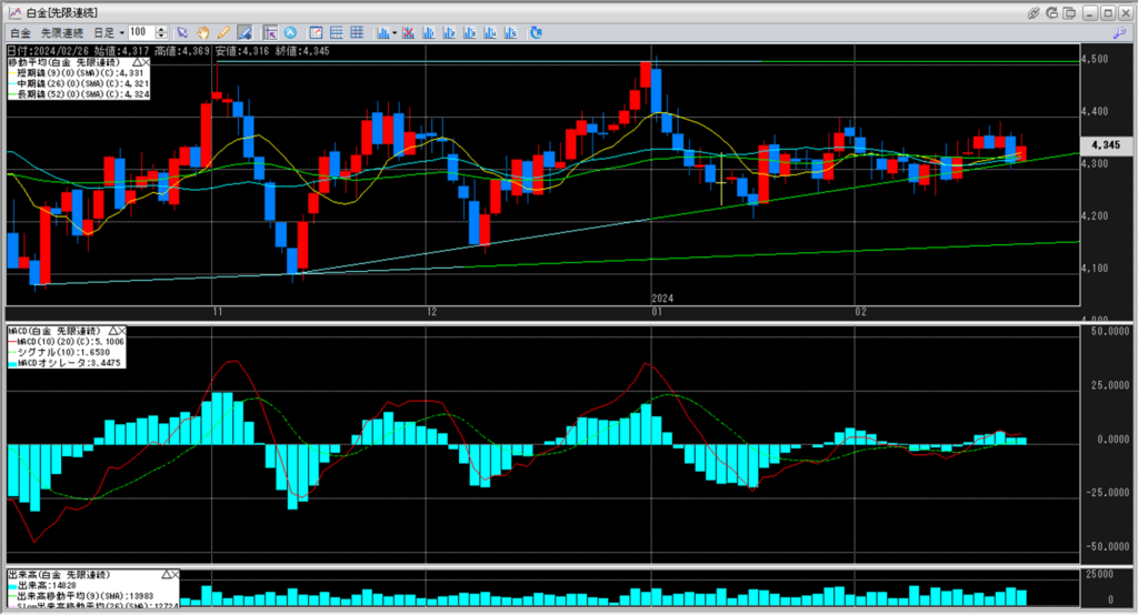 白金のチャートを見ると、4,100円から4,200円を下値とし、