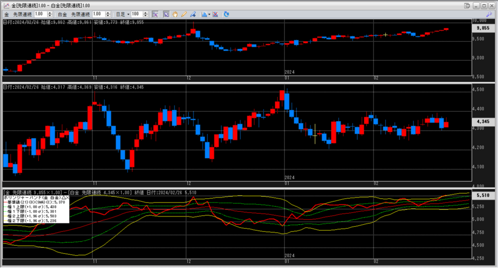 金白金の鞘をボリンジャーバンドで見ていきます。
