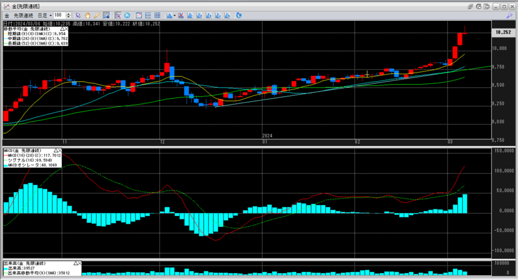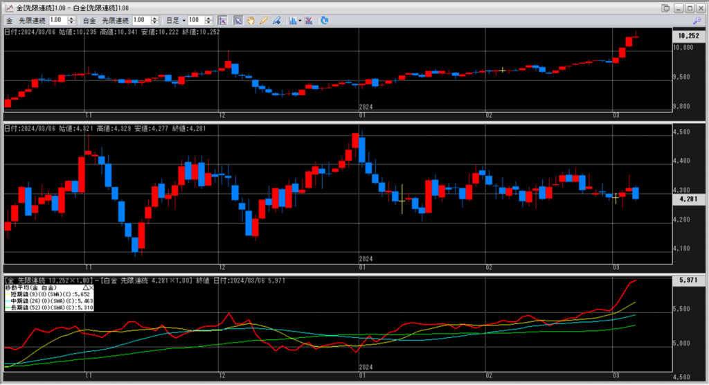 下記に金白金鞘の移動平均線のチャートを貼り付けています。
