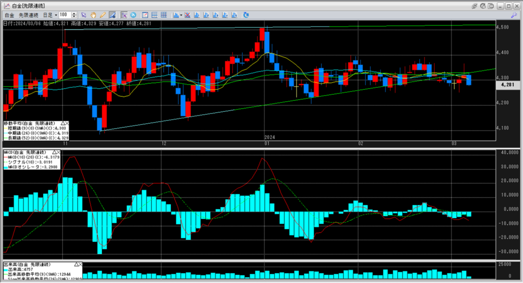 白金のチャートを見ると、4,100円から4,200円を下値とし、
