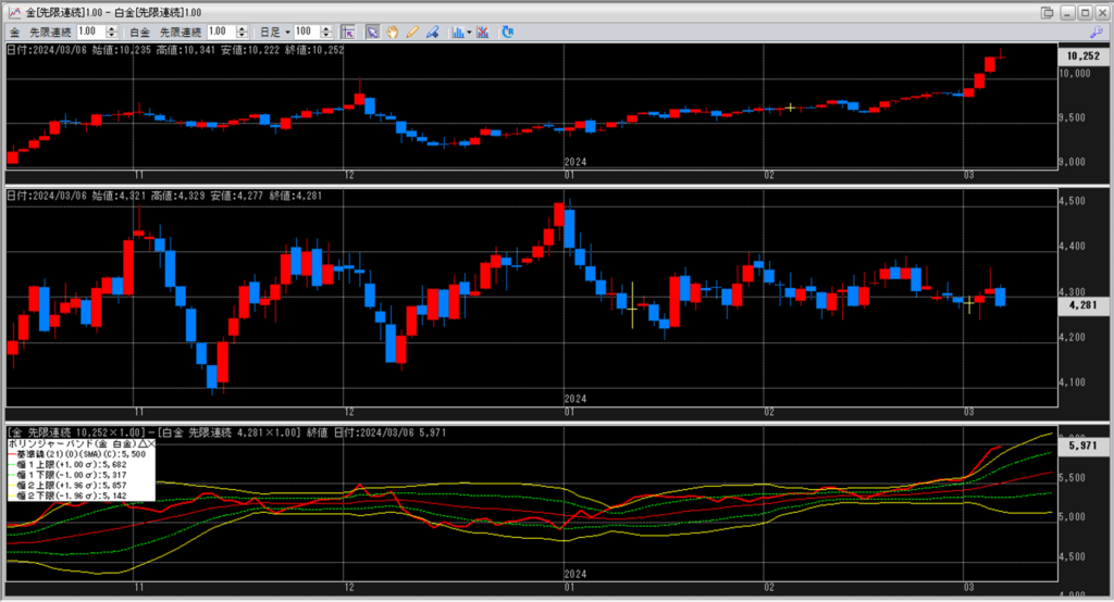 金白金の鞘をボリンジャーバンドで見ていきます。