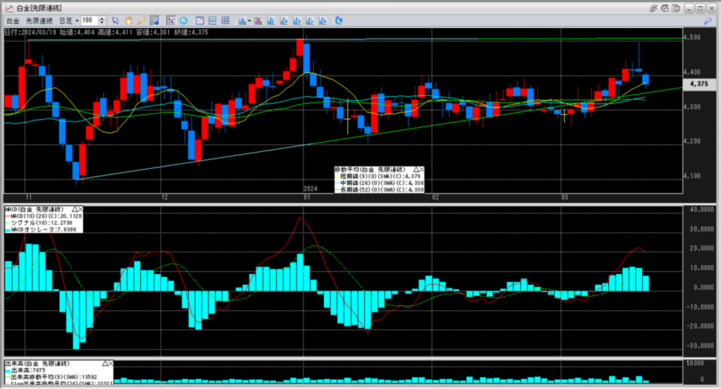 白金のチャートを見ると、4,100円から4,200円を下値とし、