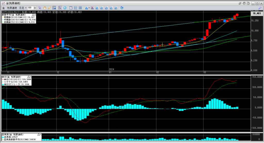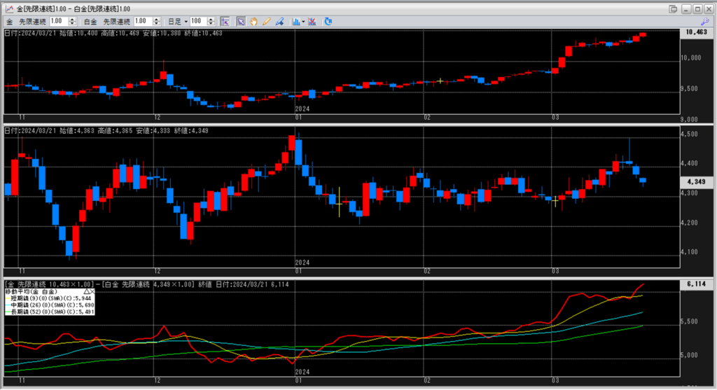 下記に金白金鞘の移動平均線のチャートを貼り付けています。