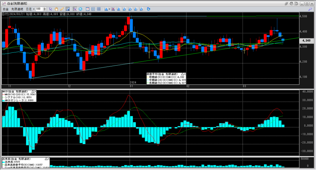白金のチャートを見ると、4,100円から4,200円を下値とし、