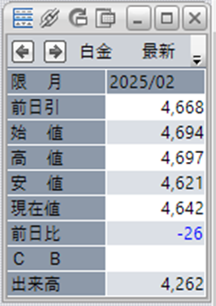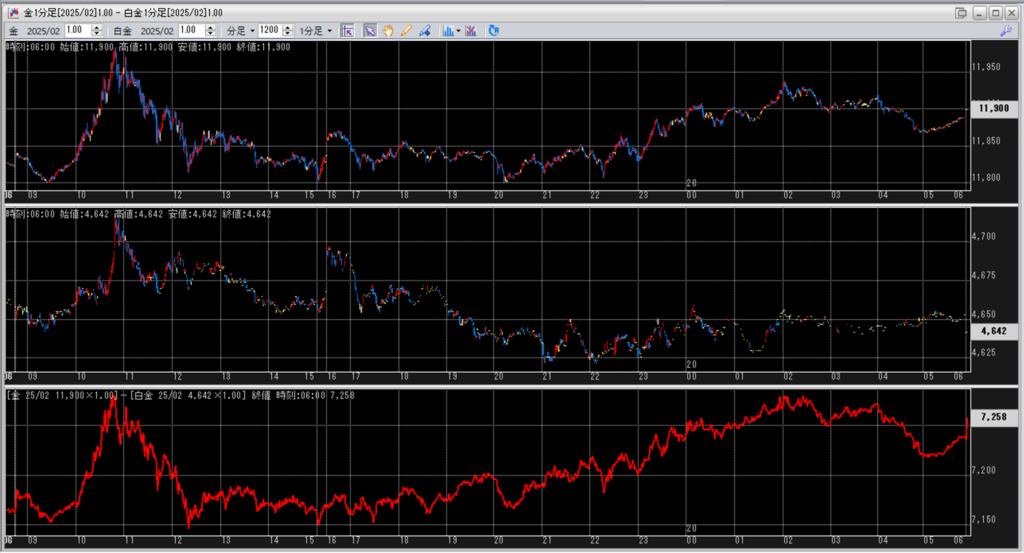 取引時間中には、金白金鞘の最大値を更新してきています。