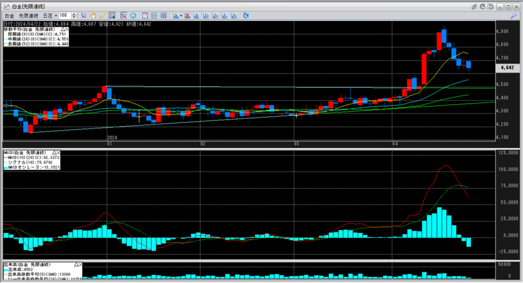 白金のチャートを見ると、4,100円から4,200円を下値とし、