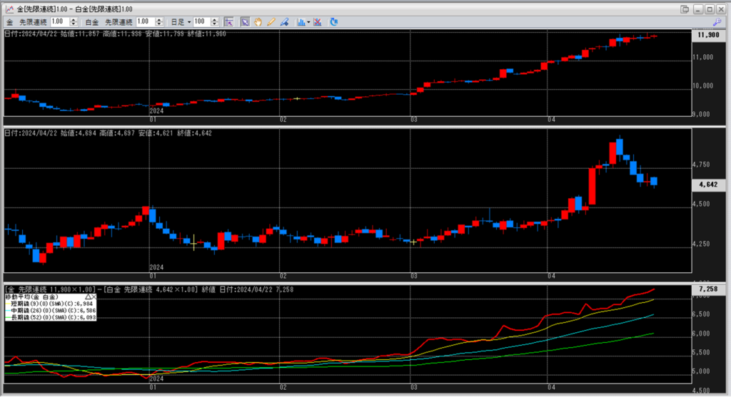 下記に金白金鞘の移動平均線のチャートを貼り付けています。