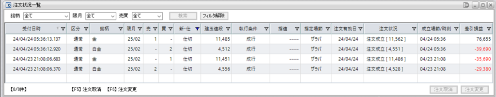 鞘縮小の仕掛け金売り1枚-白金買い2枚を1組、損切し、-65,070円。