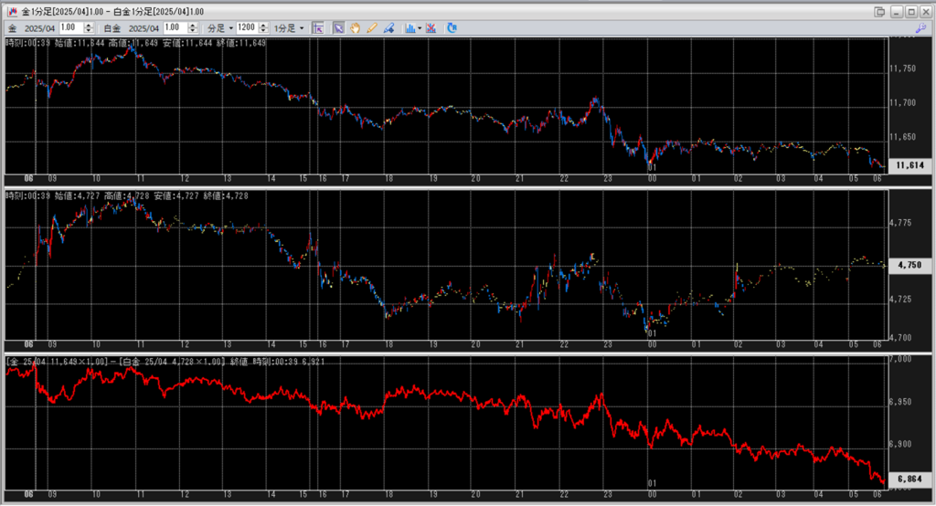 下:金白金鞘(金白金の価格差 = 金1グラムの価格 - 白金1グラムの価格)