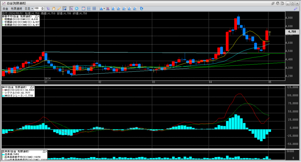 白金のチャートを見ると、4,100円から4,200円を下値とし、