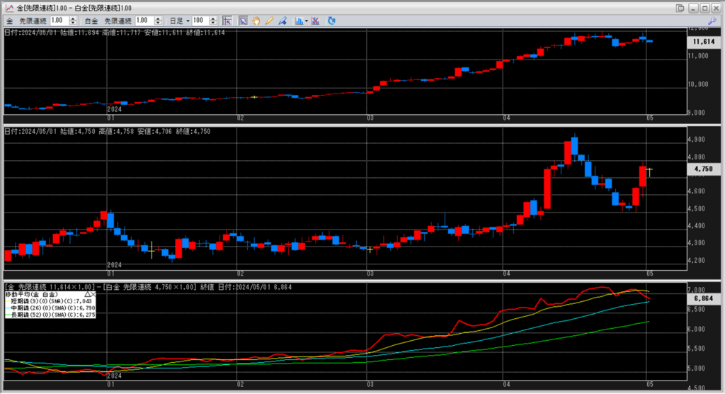 下記に金白金鞘の移動平均線のチャートを貼り付けています。