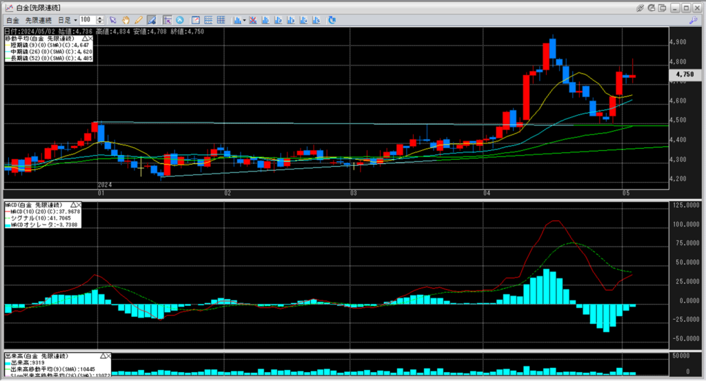 白金の値段は、6:00の終値で4,750円となっており、