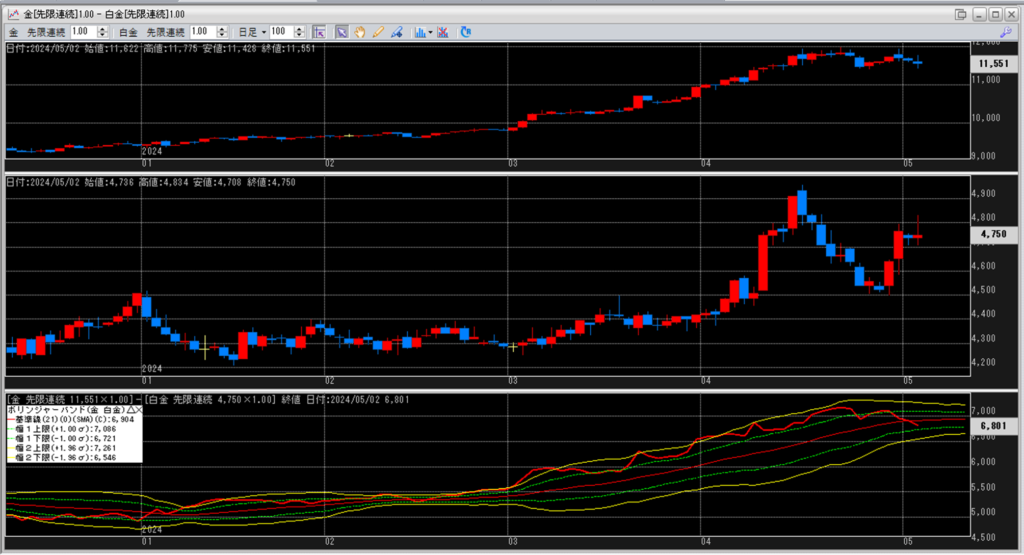 金白金の鞘をボリンジャーバンドで見ていきます。