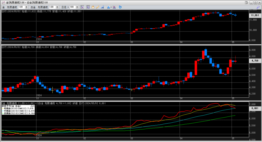 下記に金白金鞘の移動平均線のチャートを貼り付けています。