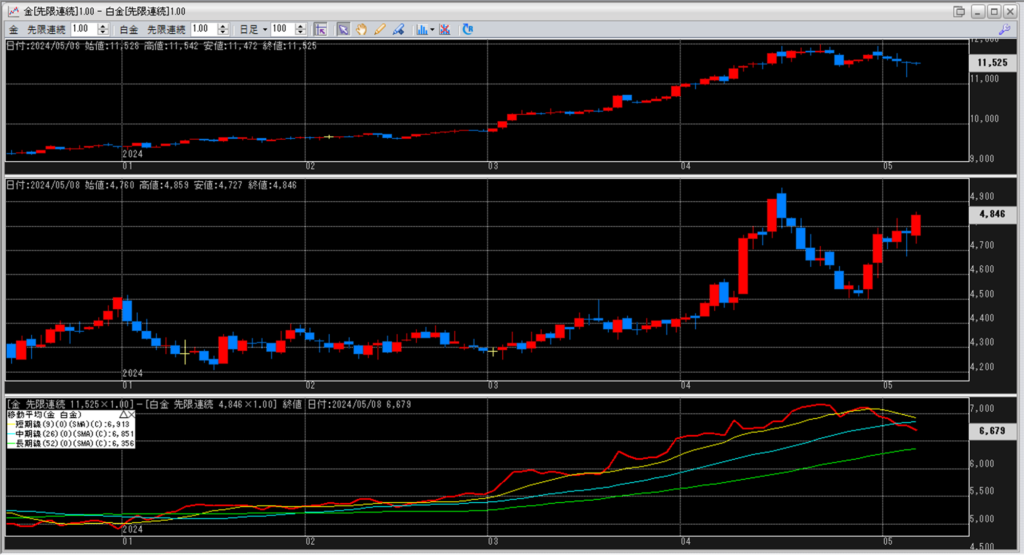 下記に金白金鞘の移動平均線のチャートを貼り付けています。
