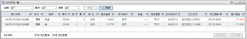 鞘拡大の仕掛け金買い1枚-白金売り2枚を1組、仕掛けました。