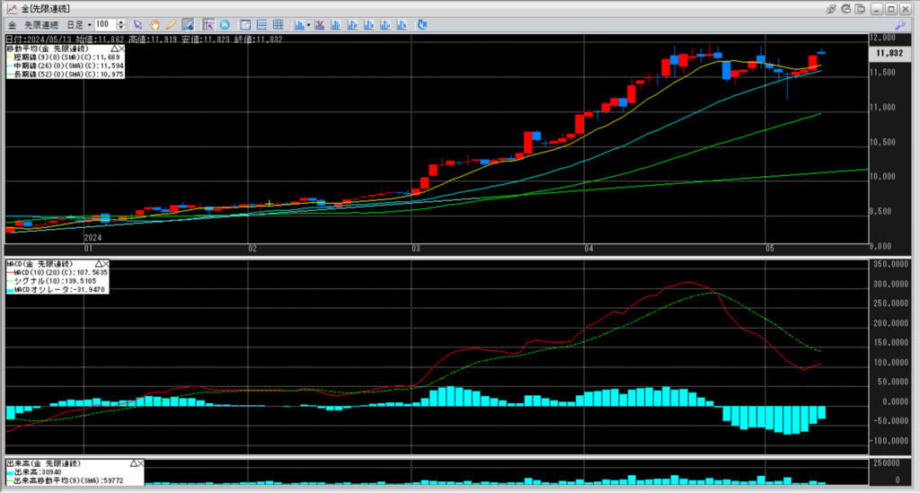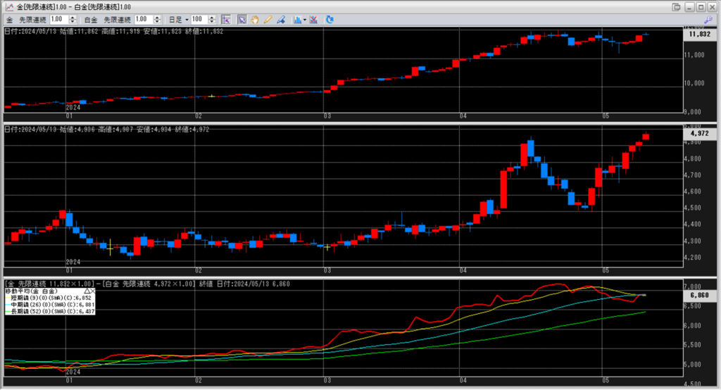 下記に金白金鞘の移動平均線のチャートを貼り付けています。
