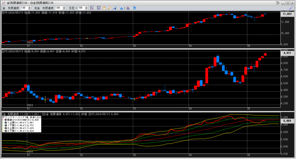 金白金の鞘をボリンジャーバンドで見ていきます。
