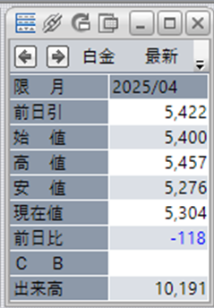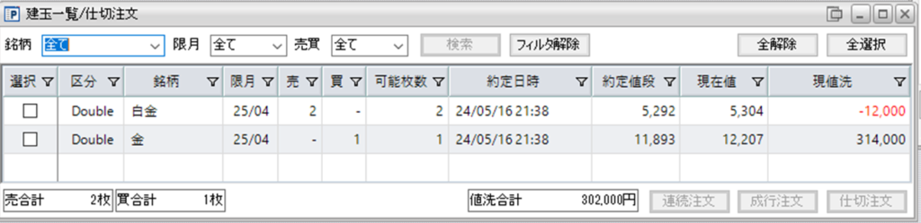 現在、鞘拡大の仕掛け金買い1枚-白金売り2枚を1組、保持しています。