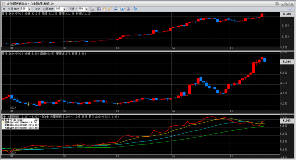 下記に金白金鞘の移動平均線のチャートを貼り付けています。