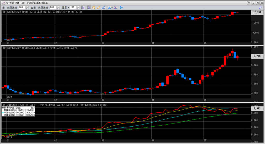 下記に金白金鞘の移動平均線のチャートを貼り付けています。