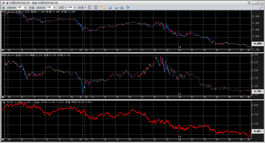 下:金白金鞘(金白金の価格差 = 金1グラムの価格 - 白金1グラムの価格)
