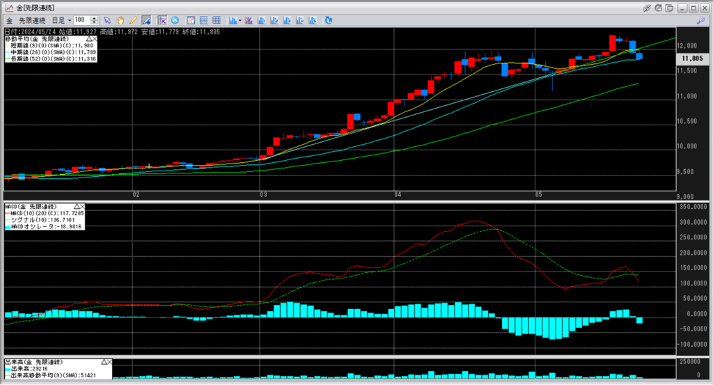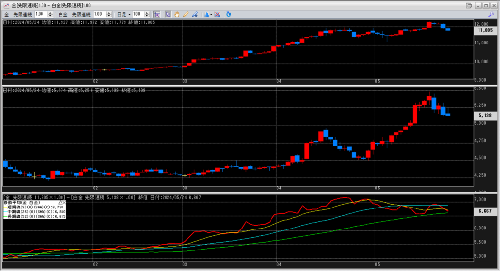 下記に金白金鞘の移動平均線のチャートを貼り付けています。
