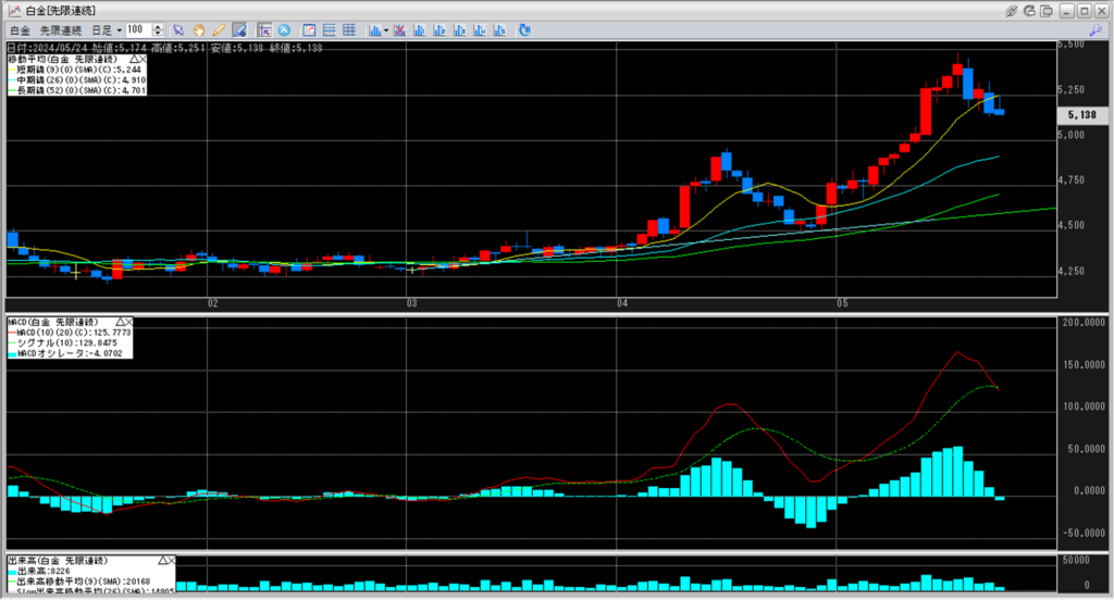 白金も弱含み始め、短期線を割り込み、デッドクロス化しています。