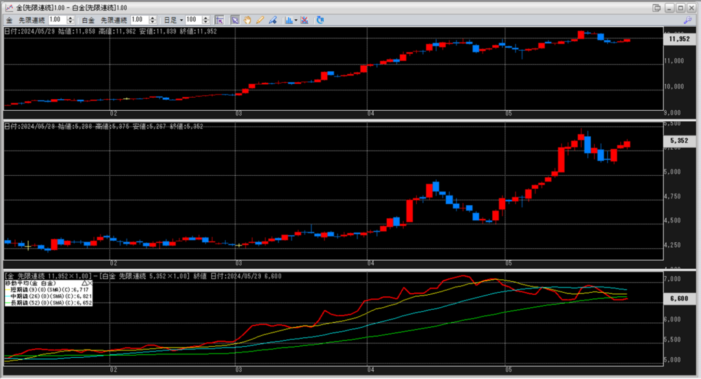 下記に金白金鞘の移動平均線のチャートを貼り付けています。
