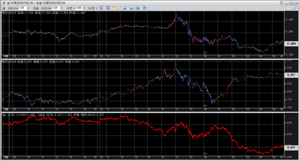 下:金白金鞘(金白金の価格差 = 金1グラムの価格 - 白金1グラムの価格)