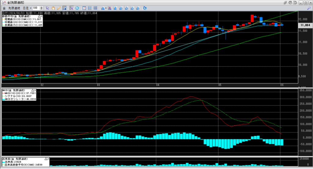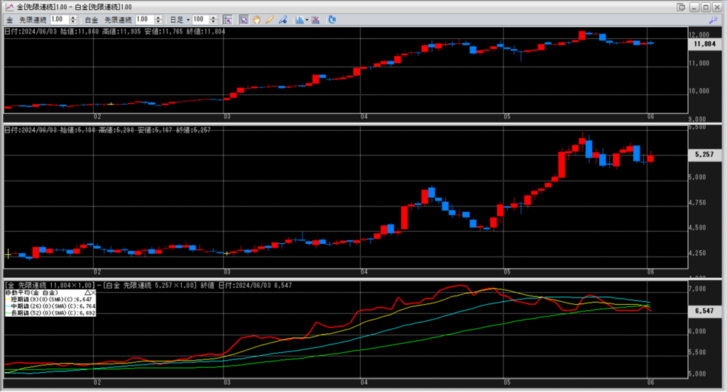 下記に金白金鞘の移動平均線のチャートを貼り付けています。