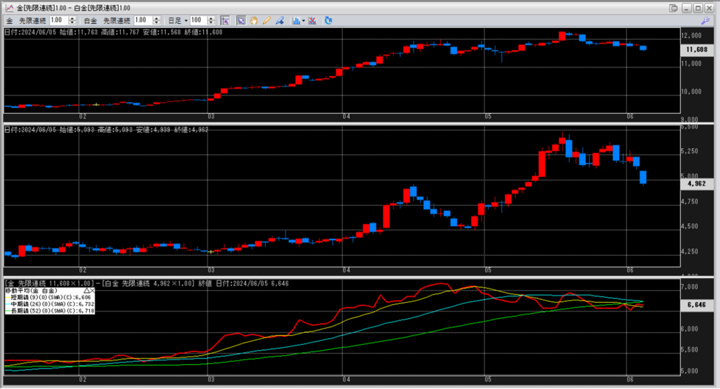 下記に金白金鞘の移動平均線のチャートを貼り付けています。