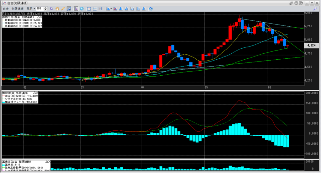 一番下に位置している長期線4,872円で白金価格は下げ止まっているような状況です。