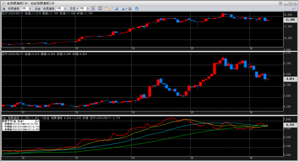 下記に金白金鞘の移動平均線のチャートを貼り付けています。